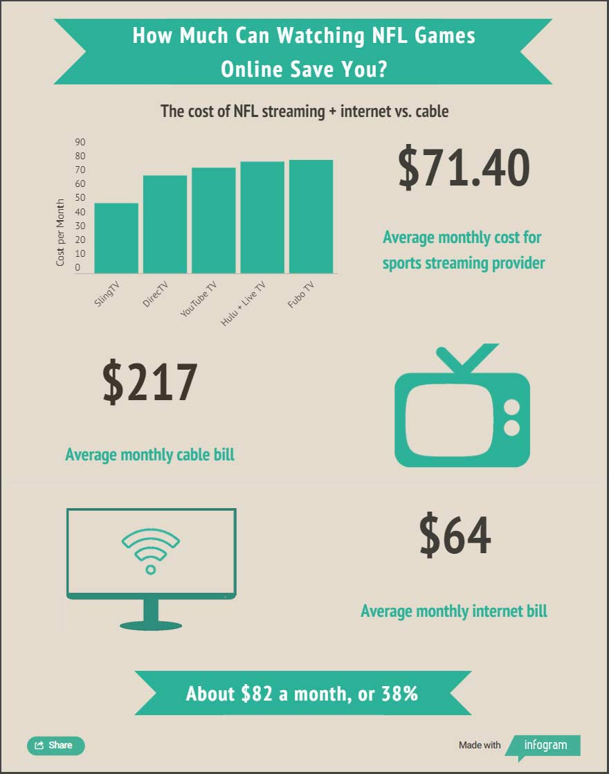 • Cost: Despite free NFL broadcasts being a thing of the past, watching from home is still waaay cheaper than buying tickets. Even a subscription to Sunday Ticket ($378) is cheaper than the average single game ticket.